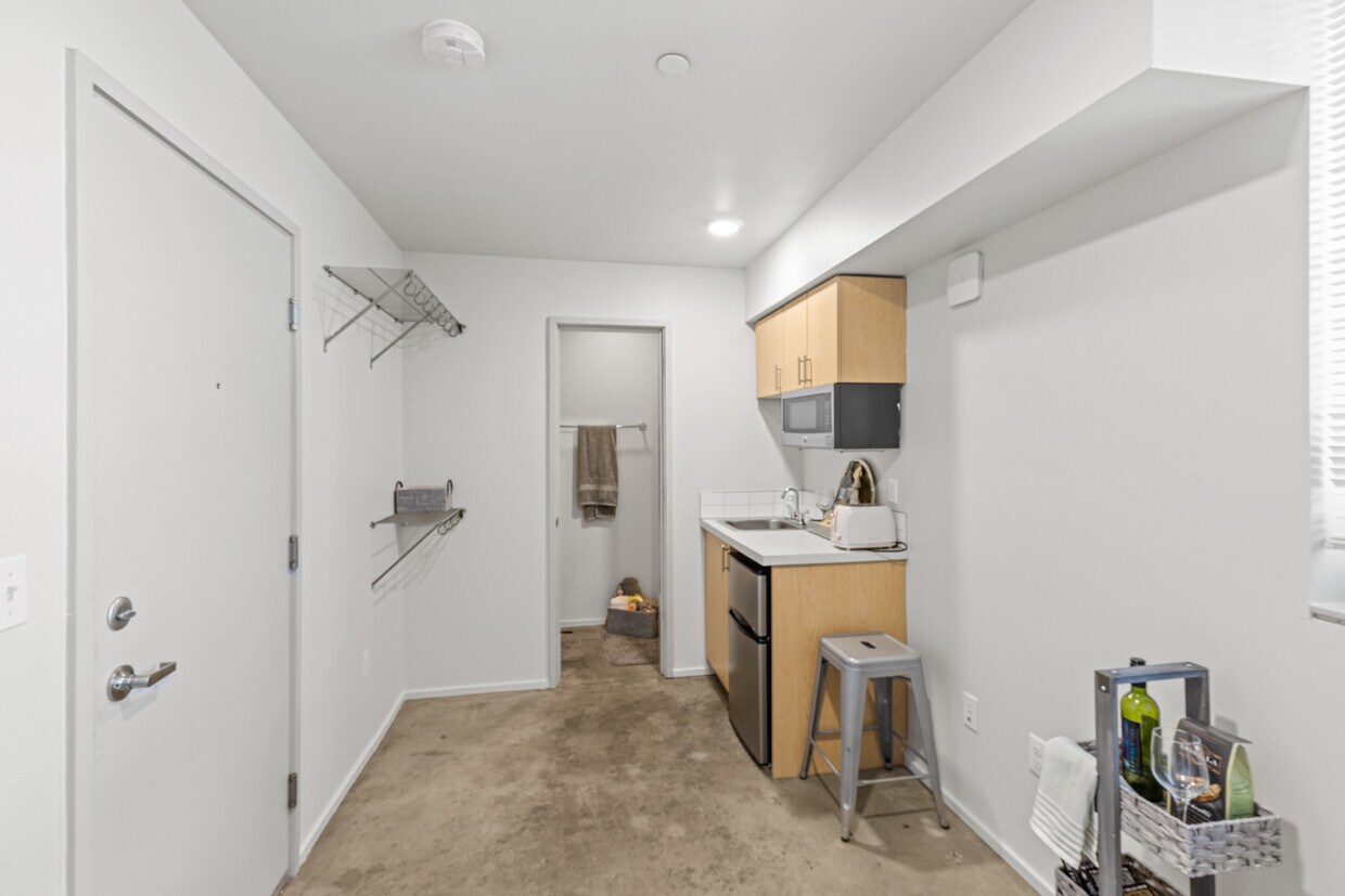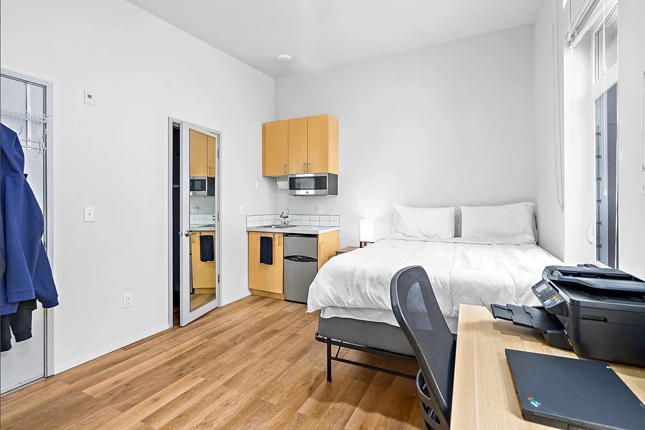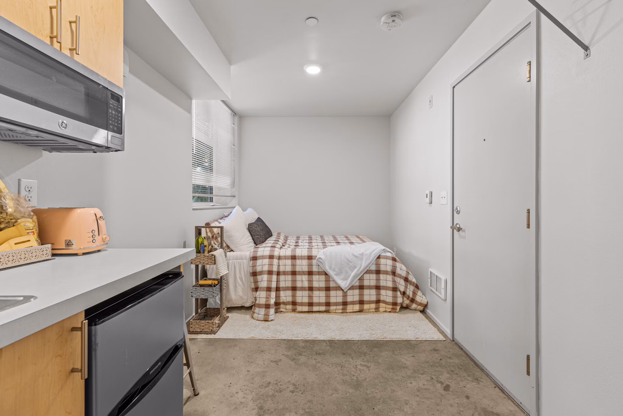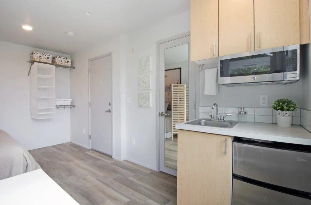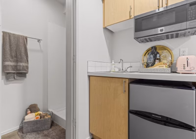 Each of our upscale micro-studios is thoughtfully designed to maximize both style and function, coming equipped with a kitchenette and contemporary finishes. We’ve amplified the effect of the large windows by using high ceilings and a bright, crisp white paint throughout. This design choice ensures that every home is bathed in abundant natural light, enhancing the sense of space and making your studio feel instantly airy and open.