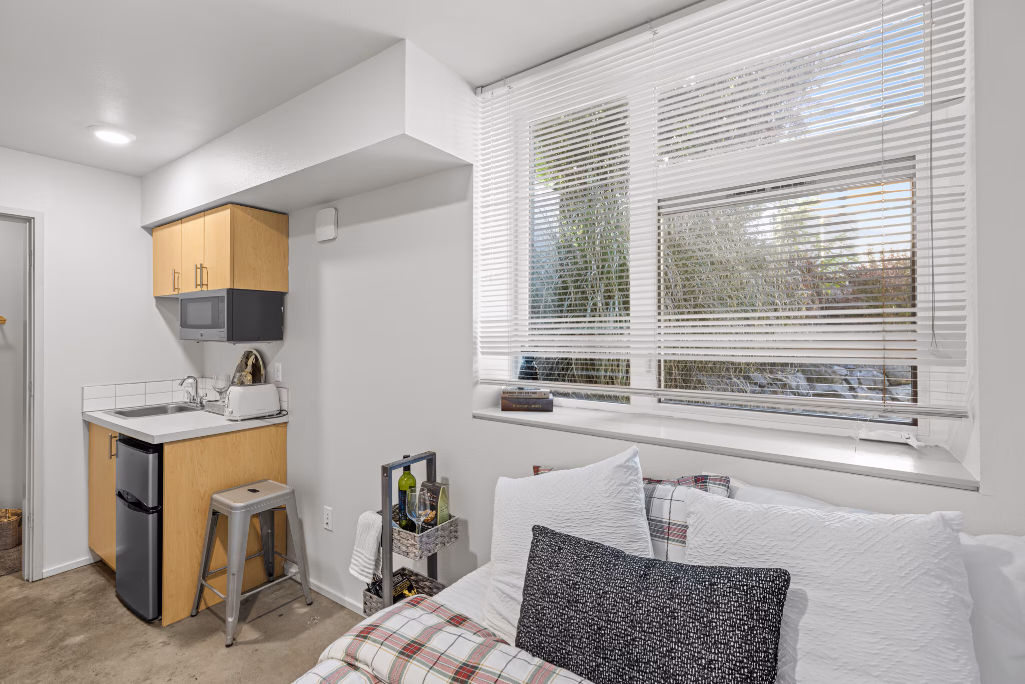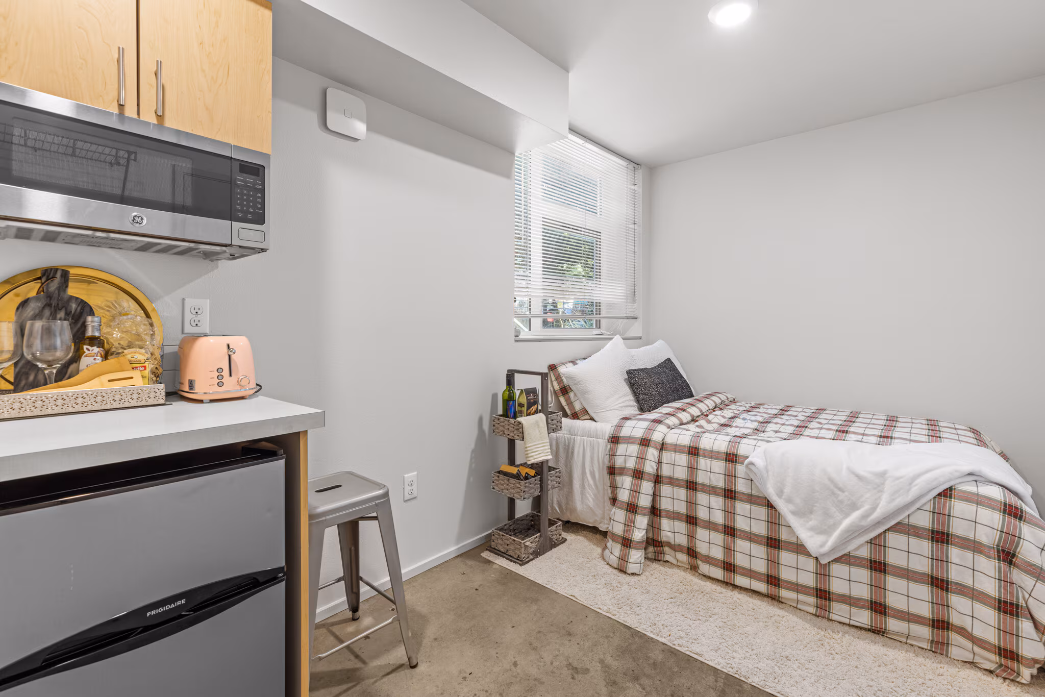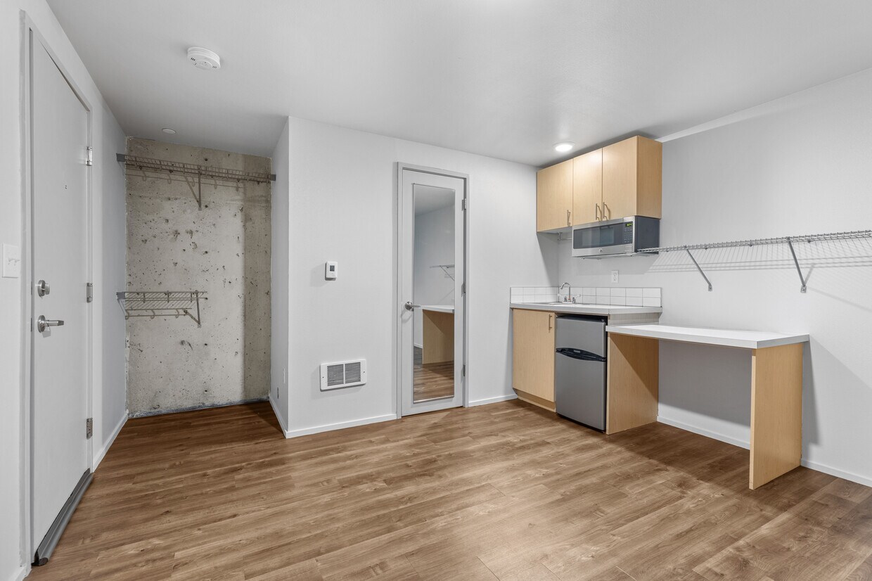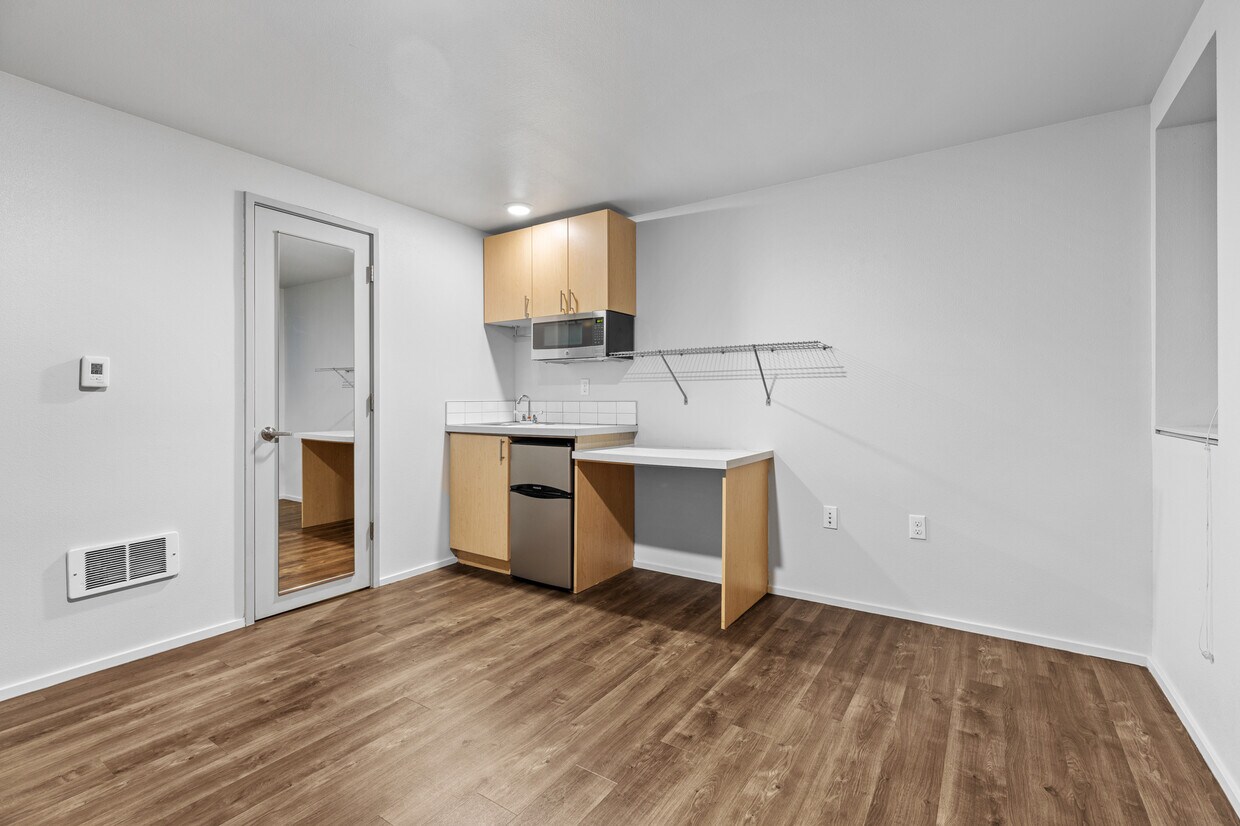 Each of our upscale micro-studios is thoughtfully designed to maximize both style and function, coming equipped with a kitchenette and contemporary finishes. We’ve amplified the effect of the large windows by using high ceilings and a bright, crisp white paint throughout. This design choice ensures that every home is bathed in abundant natural light, enhancing the sense of space and making your studio feel instantly airy and open.
